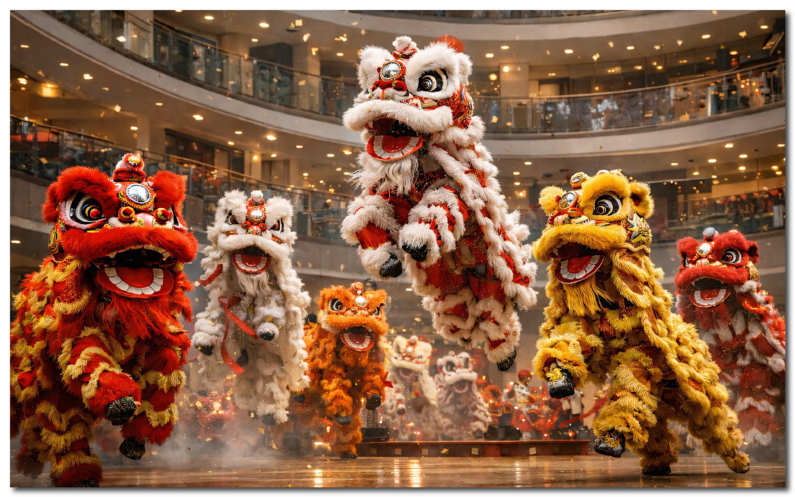 Large-scale lion dance shows like this are usually reserved for major events or outdoor festivals, so seeing them in a mall setting, and for free, is relatively rare.